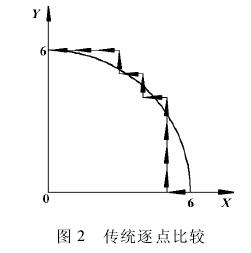 可设在第一象限中,对半径为 6 的圆弧进行插补,具体插补的过程在这里不在赘述,其中新的逐点比较法插补运算过程如表 1 所示。图 2 为传统的逐点比较法插补轨迹,图 3 为新的逐点比较法插补轨迹。