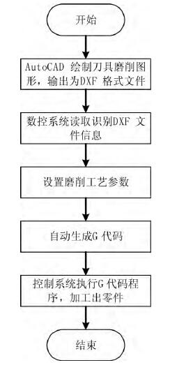 刀具磨削流程如图2所示,首先用CAD绘制刀具磨削加工图形轨迹,输出为DXF格式文件,然后通过U盘或网络接口将DXF文件导入到数控系统中,数控系统读取对应DXF 文件,设置工艺参数后,根据刀具磨削处理算法自动生成加工程序,最后操作数控系统加载已生成的加工程序,控制机床完成刀具磨削加工。