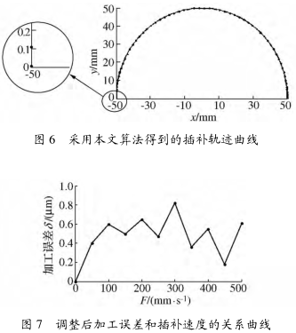 1) 采用圆弧的理论长度 πR=157. 079 6 mm 进行加减速处理,在插补速度 F = 300 mm/s 的条件下,所得的轨迹如图 4 所示。从图 4 中可以看出,插补轨迹超出了理论轨迹,存在明显的加工误差,加工轨迹终点坐标为(-49. 995,-0. 020 4)。而且加工误差随着速度的增大而增大,如图 5 所示。