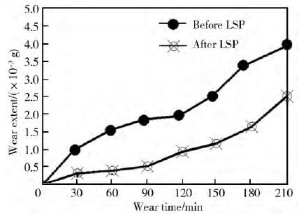 图 5 M2 试样经激光冲击处理前后的磨损量曲线对比