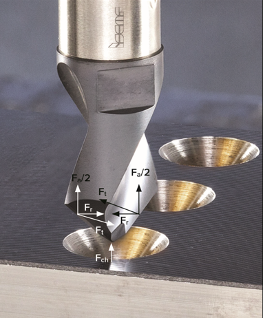 在钻削中(图3):轴向力Fa对应钻头的主切削刃(刃口)。该力沿钻头轴线压缩钻头,并与作用于钻头横刃的力Fch共同决定进给驱动的功率消耗。