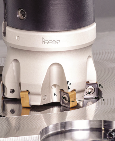 在铣削中(图2):径向力Fr与车削类似,将铣刀推离工件。Fr和Ft的合力Fb称为"弯曲力",会使铣刀产生弯曲变形。该合力在进给运动轴线上的投影形成由机床进给驱动引起的反作用力。轴向力Fa沿铣刀轴线作用,对主轴单元轴承产生载荷。