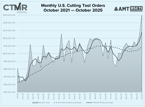 AMT(美国机械制造技术协会)官网12月19日消息显示,根据AMT与美国切削工具协会(USCTI)合作发布的切削工具市场报告,2025年10月美国切削工具出货总额为2.501亿美元,较2025年9月增长12.7%,较2024年10月增长14.7%。从今年年初至今出货量首次呈正向趋势,总出货量达到21.3亿美元,较2024年同期增长0.6%。