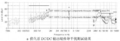 图 9 给出了增加优化措施后的 DC / DC 变换器实验波形,其中图 9a 是优化后低压输出端正极传导干扰测试结果, 图 9b和 c 是优化后 DC / DC 变换器在 150k Hz~200MHz 频域范围内垂直方射干扰测试结果。 实验结果表明,通过增加包括应用软开关技术,增加输出整流二极管吸收电路,\改善 EMI 滤波器,减小分布及寄生参数等优化措施后,大幅度降低了 DC / DC变换器的传导干扰和辐 射干扰 , 使 DC / DC 变 换 器 达 至GBT18655 标准。