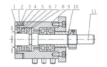 1- 自制锁紧螺母,2- 顶丝,3- 衬套,4- 配磨垫片,5-密封,6- 推力轴承,7- 衬套,8- 半圆形挡圈,9- 轴承座,10- 锁紧螺母,11- 丝杠