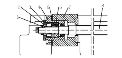 1- 锁紧螺母,2- 衬套,3- 端盖,4- 轴承舱,5- 配磨垫片,6- 角接触球轴承,7- 轴承座,8- 丝杠