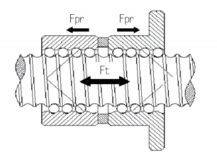 预拉伸拉伸距离的变化将会造成丝母部分接触点及接触面积改变,如图 1 所示,在 Ft 拉伸时超过目标预拉伸力数值,丝杠导程大于目标值,丝杠螺母的预紧力会减小,导致螺母滚珠的接触刚度降低 ; 反之,丝杠拉伸不足时,丝杠导程小于目标值,丝杠螺母预紧力会增加,导致螺母滚珠接触刚度增加。除此之外,可以看出预拉伸结构不仅弥补热变形的伸长量,同时还减小了滚珠的摩擦,减少了发热量。