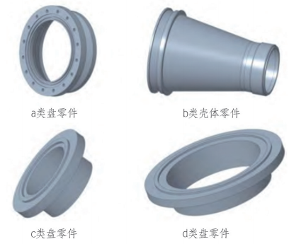 在车间主要承担生产的回转类零件中,零件规格一般在 Φ75~Φ715mm。其中 Φ300mm 以下的占 73.59%,超过 Φ300mm 的盘类、小直径筒类零件仅占 26.41%,且加工中变形控制难度大,需随时根据变形情况调整加工轨迹和参数,不宜于采用自动化单元方式加工。因此,项目选定直径在 Φ300mm 以下的盘类、小直径筒类零件作为主要加工对象。为较好覆盖各个直径范围,分别选取 Φ100mm 以下、Φ100~Φ200mm、Φ200~Φ300mm 的 3 种 法兰盘和 Φ200~Φ300mm 的一种小直径筒类零件作为该柔性智能制造单元的试加工零件。