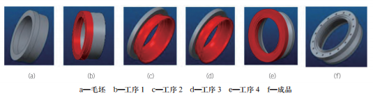 毛坯→粗车大端,留余量 2mm,保证外圆Φ234mm(加工时间 0.2h)→掉头粗车小端,留余量 2mm,保证外圆 Φ212.4mm(加工时间 0.4h)→夹大端,精车小端,保证设计尺寸Φ208.4mm,去毛刺(加工时间 0.25h)→夹小端,精车大端,车密封槽,保证设计尺寸 Φ230mm,车工工序转换为铣工、铣孔、去毛刺(加工时间0.4h)→成品。每一工序零件状态和需加工的部位(红色标出)如图 4 所示。