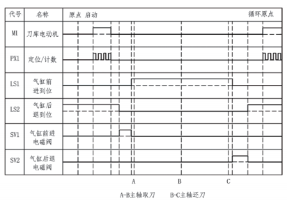 7)在主轴上有刀的情况下,需要事先计算出哪个刀位是空刀位,再将主轴上的刀抓取下来,送入指定刀位,再执行上述动作,完成下一次的换刀过程。时序如图 6 所示。