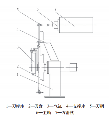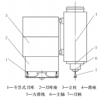 方案一,采用侧挂式刀库,如图 1 所示,斗笠式刀库 1,通过刀库座 2 与立柱 3 使用螺栓固定在一起,滑座 4 在立柱 3 上能够上下运动,主轴 6 安装在方滑枕 5 上,能够在滑座 4 内实现前后运动,刀柄 7 通过斗笠式刀库 1 中的执行机构,带动刀盘整体运行至主轴 6 的中心线上。