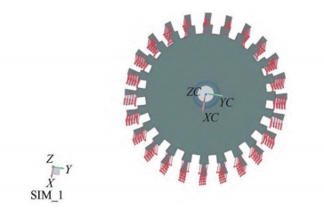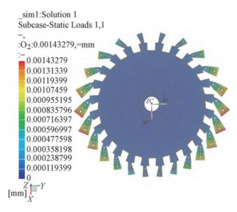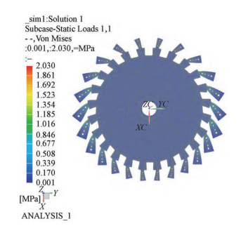 根据位移、压力及载荷分析可知,在上述条件下,在最大压强为 2.03MPa 的情况下,位移最大变化量是0.0014mm。载荷方向如图5所示,通过图形可知,载荷最大的方向存在于刀盘外侧刀套组件处,尤其是在中心线上下两侧,因此,这些位置变形量也是最大的。目前的分析条件是在满刀的情况下,同时刀具均是最大质量,变形量在允许范围之内,实际工况是所用刀具由加工工艺来决定,刀具质量会因种类不同,而存在差异,因此,通过上面的分析可知,该刀盘的结构能够满足主机的使用要求。从图 3 位移分析中可知,中间部分的变形量很小,从降低电动机驱动负载的角度分析,可以将刀盘中间增开圆孔以减轻质量。