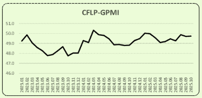 具体到中国,国家统计局服务业调查中心、中国物流与采购联合会发布的2025年10月份中国制造业PMI为49%,较上月下降0.8个百分点,结束了连续2个月上升走势。从历史数据来看,往年同期多有下降。今年10月份受十一中秋双节长假扰动及外部因素影响,制造业短期波动相对明显。结合分项指数以及分行业指数变化来看,10月份制造业出口明显收紧带动需求整体偏弱运行,企业生产活动小幅放缓,大中小企业运行均有所承压,但新动能和消费品制造业保持稳中有增,市场价格仍有积极变化,宏观经济仍有趋稳运行基础。