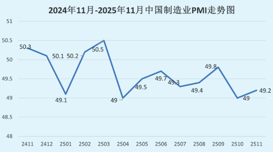 国家统计局服务业调查中心、中国物流与采购联合会发布的2025年11月份中国制造业采购经理指数(PMI)为49.2%,比10月上升0.2个百分点。