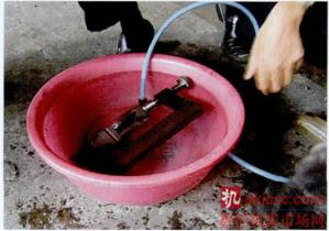 将油嘴孔存在砂眼缩松漏水缸盖供给毛坯铸造厂家分析,将存在缺陷的油嘴孔部位切割,采用泵水(见图7)和浸渗方式确认是否存在漏点,经验证,漏点存在。因此我公司与毛坯铸造厂家明确:缸盖油嘴孔存在肉眼观察到的大缺陷,直接判定毛坯为废品;缸盖铜套漏水发现油嘴孔存在小缺陷,在毛坯铸造改进期间,铜套补压两次仍漏直接判定毛坯为废品。