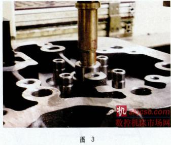 对多次漏水情况,拔铜套后没有发现铸造砂眼缩松,没有发现人为漏放密封圈、密封槽切屑等原因的缸盖,再用电动磨头对油嘴孔各贯穿孔处打磨去除尖角,彻底消除飞边、翻边,经验证,再次补压铜套全部不漏。