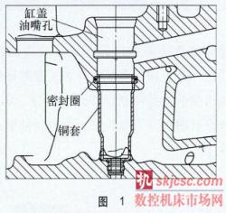 铜套大头密封部位或小头密封部位漏水都可能造成故障。为确定漏水部位,采取手动封堵装置(该装置采用内部充液),通过随机抽取20台套铜套漏水缸盖充液试验,结论为全部是油嘴孔铜套大头漏水。
