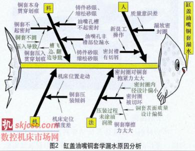 针对油嘴孔铜套大头部位漏水,采用鱼刺图进行原因分析(见图2)