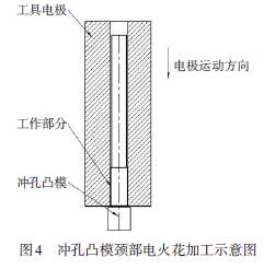 因冲孔凸模工作部分同冲孔凸模颈部(装配在固定板的部分)一般都有较高的同轴度要求,所以不适宜在无心磨床上磨削。现在可以采用加工套空心圆孔电极(见图4),用来加工冲孔凸模与固定板配合的颈部部分,保证尺寸精度、配合精度以及同轴度。此工艺不用加工中心孔,减少了加工步骤,降低了工作难度,提高了材料的利用率,提高了冲孔凸模形状及尺寸的加工精度,缩短了加工周期,降低了对操作工人的技能要求,较大程度提高了生产效率。