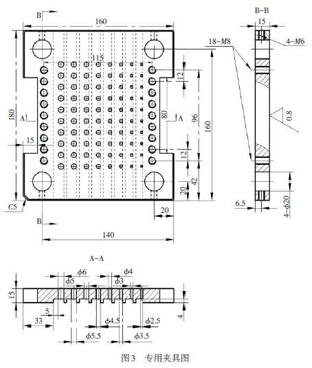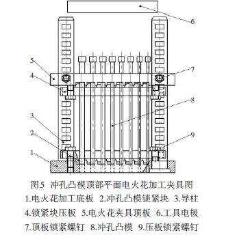 采用专用夹具(见图5),利用电火花脉冲加工冲孔凸模顶部平面,电火花加工时主轴垂直移动;工具电极与工件表面有放电间隙,电极与工件不直接接触,工件不会因切削力作用而产生移动或转动的现象;电极运动终止位置由数控程序控制,尺寸加工精度高且便于控制。