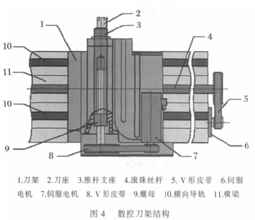 刀架横向方向移动是沿固定在横梁上的两条导轨滑移, 由一个三相伺服电机驱动控制。伺服电机电机输出通过V 型皮带带动横向滚珠丝杆, 横向滚珠丝杆驱动刀架上安装的螺母, 从而实现刀架横向移动。