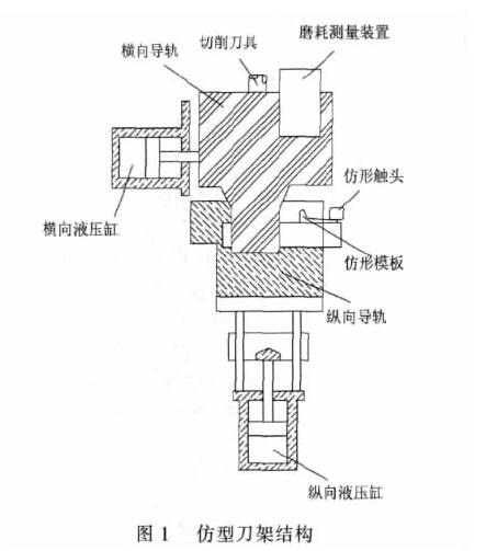 镟床床身左右两侧各有一个刀架, 现就其中一边作出介绍, 具体结构如图1 所示。仿型刀架主要由纵向液压缸、横向进给液压缸、纵向进给导轨、横向导轨、仿形模板、仿形触头、刀具及磨耗测量装置等组成。每个仿型刀架都装有一条横向(沿Z 轴方向) 导轨及一条纵向(沿X轴方向) 导轨。刀架由纵向、横向液压缸驱动沿着导轨作纵横向移动, 带动刀具加工切削轮对。导轨经过硬化研磨处理耐磨可以保证仿型刀架长期的工作精度。