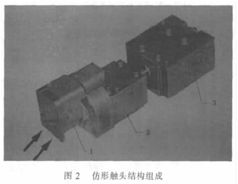 刀架的纵横向液压缸的移动由仿形触头控制, 仿形触头紧贴轮对廓形模板移动, 控制接通相应的油路, 驱动液压缸移动。仿形触头主要由仿形头1、反馈装置2 及液压阀3 组成。结构如图2 所示