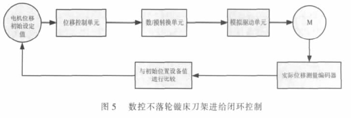 CNC 加工刀架进给由纵横向伺服电机驱动控制, 采用闭环控制系统, 控制原理如图5 所示。闭环控制使用增量式光电检测装置, 该装置安装于伺服电机的转轴上, 用于检测监视伺服的转角, 推算出刀架横向、纵向的实际位移量。编码器产生正弦/余弦模拟电平反馈信号, 信号反馈到NCU 装置的比较器中, 与程序指令值进行比较, 用差值进行控制。该控制模式的控制精度可达到0.1mm, 满足镟床的切削加工要求。