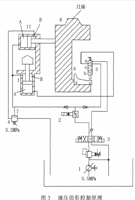 刀架仿形移动加工切削的液压控制原理, 如图3 所示。当电磁阀3 动作, 启动仿型进给, 从液压泵1 供给的液压油通过可调比例阀2 进入纵向液压缸Ⅰ的B 腔和进入横向液压缸Ⅱ的A 腔。由于液压油受到由压力阀4 限制停留在横向液压缸Ⅱ的B 腔内, 刀架不能横向移动。仿型模板6 朝仿型触头5 垂直向上移动。