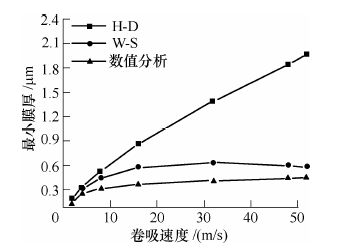 (2) 对拟合公式的适用性进行了研究,并对比了不同速度下三种算法的最小膜厚,结果表明在低速时,三者最小膜厚较为一致,随着速度的提高三者膜厚相差越来越大,尤其是H-D 膜厚偏差最大,而热修正最小膜厚在速度增大到一定程度后反而降低。