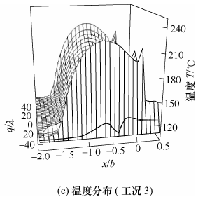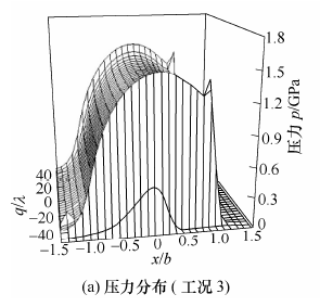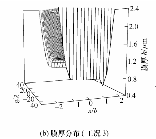 以工况3 为例,得到航空发动机主轴承内圈受载最大滚子的润滑油膜压力、膜厚和温度三维分布如图6 所示,图中b 为x 方向赫兹接触半宽。由图可知,润滑膜最大压力约1.5 GPa,最小膜厚约0.4μm,接触区最大温度约220 ℃,并且在出口区,润滑油油膜出现明显的出口颈缩、二次压力峰和温度峰。