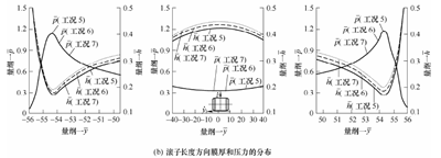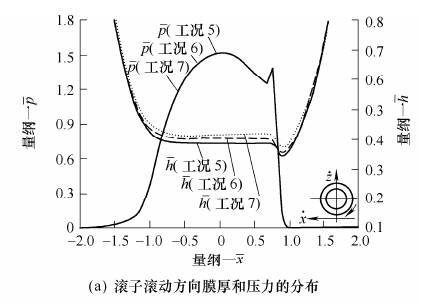 图9 是不同转速下,航空发动机主轴滚子轴承内圈受载最大的滚动体在x 方向和在y 方向的量纲一润滑膜压力和膜厚分布图。图9 中工况5 的转速为10 000 r/min,工况6 的转速为11 000 r/min,工况7 的转速为12 000 r/min。由图9 可知,随着转速的提高,航空轴承润滑膜的膜厚增大,压力没有明显变化。这是由于滚子受到的载荷较大,虽然速度较大,离心力仍然相对较小,接触载荷减小的仍然很少,故油膜压力变化不明显。