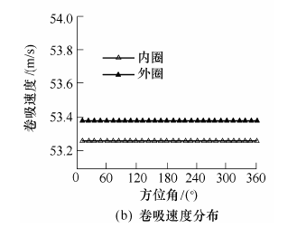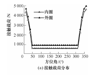 以工况4 为算例,经过拟动力学分析,获得图4 所示滚动体与套圈在不同方位角下的接触区工况(接触载荷和卷吸速度)分布。由图可知绝大多数滚子处于非承载区,并且承载区不同滚子的接触载荷相差较大,不同承载滚子的卷吸速度基本相同。