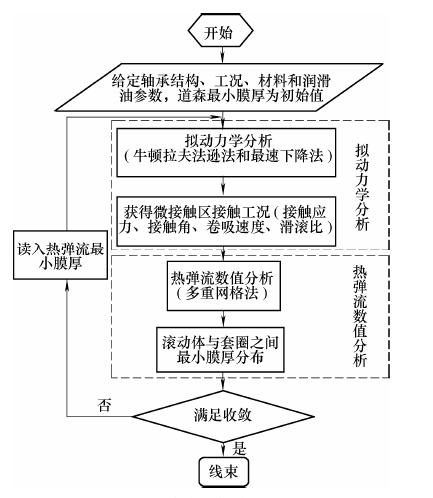 图3 为数值分析流程图,在拟动力学分析中,通过牛顿拉夫逊法和最速下降法求解滚动体、套圈和保持架的拟动力学平衡方程,获得滚动体与套圈的微区运动和受力状态。航空发动机主轴轴承拟动力学方程具体求解过程见文献[13]。拟动力学分析获得接触微区工况后,进行热弹流润滑数值分析求得轴承润滑状态。在弹流润滑分析中,需要将润滑方程量纲一化和离散化[15],用多重网格法对离散的润滑方程进行求解,用Gauss-Seidel 迭代法求得完全数值解。求解压力所用的网格共5 层,最高层x方向网格节点数为128 和y 方向网格节点数都为1 024。温度的求解采用逐列扫描法,温度场分析使用的网格与压力分析最高层网格完全相同,膜厚方向划分为22 个节点,包括两固体内部各6 个节点,油膜内10 个节点。