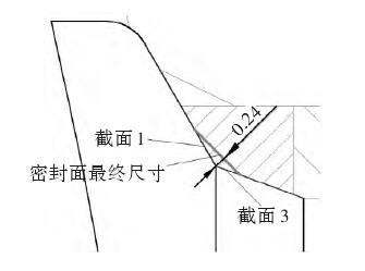 通过对密封面的加工工艺进行分析,如图 4 所示,由于导引孔刀具去除 2 个截面余量后,直接加工密封面至最终尺寸,尚留有 0.24 mm 余量,而要加工粉末冶金材料的密封面时,一次加工就要去除这么大的余量,极有可能会对加工稳定性产生影响。鉴于此,通过与刀具技术人员进行探讨,并到相关厂家调研后,最终决定对原工艺进行改进。