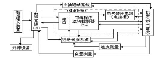 电气控制系统是数控机床硬件控制的核心部分,数控机床的电气控制系统,主要由数控装置(CNC)、伺服系统(包括进给伺服和主轴伺服)、机床强电控制系统(包括可编程控制系统和继电器接触器控制系统)等组成。如图1: