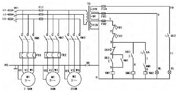 图中 M1 是主轴及进给电动机,它的作用是拖动主轴和工件旋转,并通过进给机构实现车床的进给运动; M2 为冷却泵电动机,拖动冷却泵输出冷却液;M3 为溜板快速移动电动机,拖动溜板实现快速移动。其中 M1 主轴电机作为拖动电机地位最为重要。采用这种电气原理图存在如下几个问题: