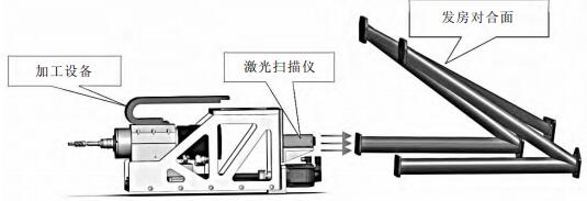 第 二 步 , 执行 发 房 对 合 端 面平 面 度、 轮 廓 检测。 加 工 设 备 回转 180°,移动至相应工位定位,激光轮廓扫描仪开始工作,扫描该对合端面轮廓信息并输入到系统,系统计算对合端面加工量和制孔位置。扫描过程如图 4 所示。