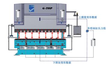 为了保证高精度的钣金折弯,在折弯机的上横梁(滑块)和下横梁(工作台)安装了传感器,在工作状态时将上、下横梁的变形量,实时准确地反馈到数控系统(PC),数控系统经过计算比对后,输出相应的补偿值驱动补偿油缸进行动态补偿,以获得满意的制件精度。