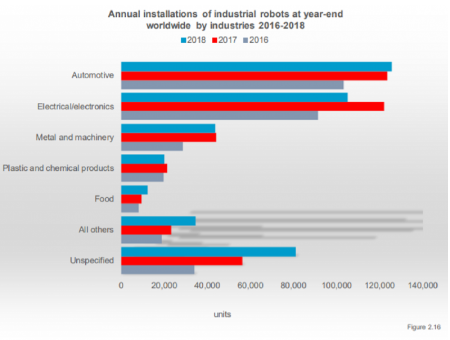 在其2019年9月公布的显示,2018年全球机器人安装量增长6%,达到422271台,价值165亿美元(不含软件和外围设备)。机器人的操作库存计算为2439543个单位(+15%)。