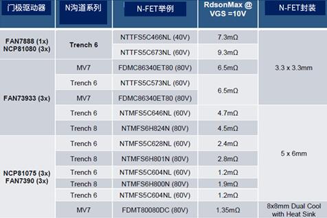 使用一个专用的逆变器网络来驱动通用臂制动器和末端执行器的BLDC相绕组,这个逆变器系统包含高达150 V耐压 的Power Trench功率器件。 下表列出了安森美半导体的Trench系列分立器件的一些成员,以及推荐的三相门极(预)驱动器: