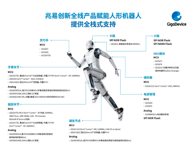 在芯片赋能机器人硬件的赛道上,兆易创新凭借多年技术积累,构建覆盖控制、存储、计算及信号链的完整产品矩阵,为人形机器人提供全栈式芯片支持。其中,GD32高性能MCU可用于多关节实时运动控制与系统调度;旗下Flash为视觉处理、决策计算提供高速高可靠的数据存储保障;模拟芯片更覆盖传感器信号调理、电机驱动、电源管理等关键环节,从感知、决策到执行全链路赋能机器人系统。