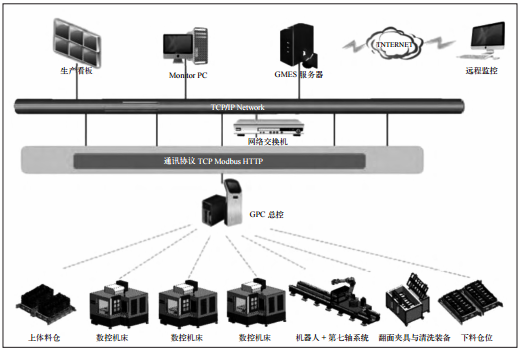 二次定位和识别系统是一项重要的技术,能提高加工效率和产品质量。二次定位夹具设计有销钉及基准定位面,这是为了保证工件放入机床夹具时的精准性,销钉能确保工件在夹具中的位置固定,不会发生偏移或晃动。而基准定位面则提供准确的参考点,使得机器人能够准确定位工件;夹具配备吹气装置,用于清洁工件表面的杂质 [7]。这样可以确保工件表面的清洁度,避免在加工过程中出现杂质导致的质量问题。在工件二次定位后,机器人会同时进行非接触式扫描读取工件信息,这种扫描方式可快速获取工件的尺寸和形状等信息。通过将这些信息发送给 GSK 总控制系统及生产管理系统,实现自动化的生产过程控制和数据管理 [8]。总控制系统可根据工件信息进行加工参数的调整,以实现最佳的加工效果;而生产管理系统能实时监控生产过程,并对数据进行分析,为生产决策提供支持。GSK制造执行系统如图 1 所示。