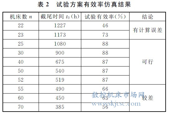 需要说明的是,基于简明考虑,本文用无替换定时截尾试验的判别标准检验其是否服从指数分布,这会带来一些误差。但当机床数量增大时,例如n≧30时,这种误差会越来越小。在表2中当机床数为22、23时,试验有效率的计算误差较大。但这并不影响仿真结果的指标意义,因为当机床数为22、23时,截尾时间依据nt0≦27000会取较大的值,它可以使数控机床的失效状况较充分显现,因而通常可以判断其是否服从指数分布。有可能无法进行分布检验的是试验机床数量较大但截尾时间较短的试验方案,但这时选用无替换定时截尾试验的判别标准误差已很小,即表2中n为40、50的计算结果误差是很小的,可满足工程应用。