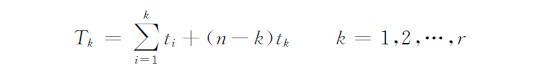 对于无替换定时截尾试验,检验数控机床失效概率密度函数是否为指数分布有如下方法[9]:设对n台数控机床进行截尾寿命试验,得到定时截尾样本t1≦t2≦…≦tr≦t0(r为失效数)。计算每次失效发生时的累积试验时间和总试验时间,其中直到第k次失效的累积失效时间为