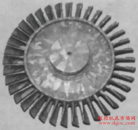 我国航空材料研究院对整体叶盘的精密铸造技术进行了深入研究,分析双性能合金材料的选择、整体叶盘组织的形成方法、控制措施和浇注工艺参数以及热处理对整体叶盘力学性能的影响,为铸造工艺设计特殊装置,使叶片凝固过程中获得径向温度梯度,并且通过不同的试验方案,成功铸造出直径120mm,带有34个叶片的涡轮整体叶盘,如图3所示[5]。