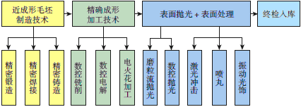 近年来,国内对航空发动机整体叶盘制造技术的研究达到一定高度,已实现整体叶盘的完整制造,通过对整体叶盘结构及制造工艺需求分析,国内采用复合制造工艺,主要划分为:近成形毛坯制造、精确成形加工、表面抛光、表面处理等过程,每个工艺阶段又划出多种工艺技术,诸多工艺技术经过复合形成各种不同的整体叶盘制造工艺流程[2],同时,其中一些技术国内尚处于研究发展阶段,其工艺流程及关键技术如图2所示。