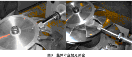 西北工业大学对整体叶盘结构及其材料特性进行大量分析,借鉴五轴联动数控铣削技术,为拟合整体叶盘叶片自由曲面,提出整体叶盘五轴联动柔性抛光系统,并建立试验平台,通过磨头机构的柔性作用,使其在抛光过程中能够适应叶片型面,对叶片表面波纹及微变形量进行自适应补偿,达到叶盘表面精密抛光[29],其建立抛光工艺实验平台如图7所示,并且对整体叶盘进行了初步抛光试验,如图8所示,目前还需对整体叶盘自动化抛光技术进行不断的完善和提高。