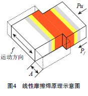 线性摩擦焊是一种固相焊接技术,在焊接压力Pf作用下,其中一个焊件相对另一个焊件沿直线方向以一定的振幅A和频率f作直线往复运动,发生摩擦粘结与剪切并产生摩擦热,摩擦界面温度上升,当摩擦表面达到粘塑性状态时,在压力的作用下焊合区金属发生塑性流动形成飞边,当摩擦焊接区的温度和变形达到一定程度后,焊件对齐并施加顶锻压力Pu,焊合区金属通过相互扩散与再结晶使金属焊为一体,完成整个焊接过程,其工艺过程如图4所示,主要包括以下5个工艺过程:初始摩擦阶段、不稳定摩擦阶段、稳定摩擦阶段、停振阶段、顶锻维持阶段[11-13]。