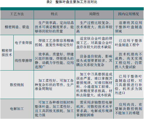 在整体叶盘制造工艺过程中,各种近成形技术与精确成形技术相互渗透,形成整体叶盘复合制造工艺,各工艺技术有其优越性和局限性,无法以一种方法替代其他所有工艺方法。而对于国内目前普遍采用的整体叶盘制造技术,如精密铸造及锻造技术、精密焊接技术、数控铣削技术、数控电解加工技术进行分析对比,如表2所示[23]。